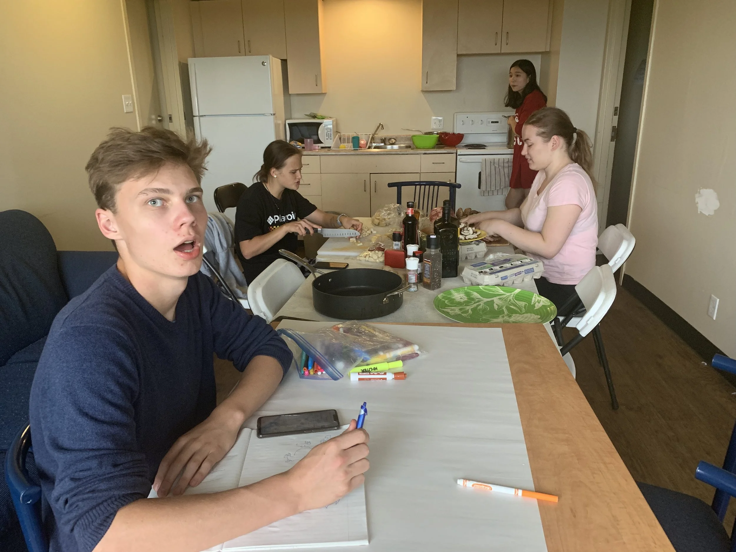 After the ice time we had playing hockey we were really hungry, so off we went to the supermarket to buy ingredients for the most super supper, the most decadent dinner, the most miraculous meal; International Supper! Today is the day when our students get to show off their culinary credentials and cook meals from their own countries! After some frying, some boiling, some stirring and a lot of laughs we had made our fabulous food, and what a fantastic feast it was! We had bubble tea from Taiwan, Miso Soup from Japan, Beef Tofu Soup from China, Potatoe Pancake from Spain, schnitzel from Germany, friend cheese and potato from Czech, and a lovely strawberry cake from France.